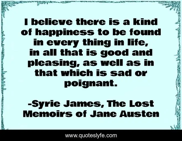 This page presents the quote "I believe there is a kind of happiness to be found in every thing in life, in all that is good and pleasing, as well as in that which is sad or poignant.". Author of this quote is Syrie James, The Lost Memoirs of Jane Austen. This quote is about life, happiness,.
