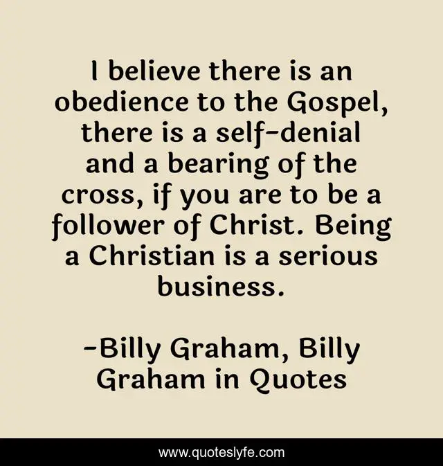 This page presents the quote "I believe there is an obedience to the Gospel, there is a self-denial and a bearing of the cross, if you are to be a follower of Christ. Being a Christian is a serious business.". Author of this quote is Billy Graham, Billy Graham in Quotes. This quote is about billy-graham, christianity,.