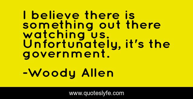This page presents the quote "I believe there is something out there watching us. Unfortunately, it's the government.". Author of this quote is Woody Allen. This quote is about i believe, believe,.