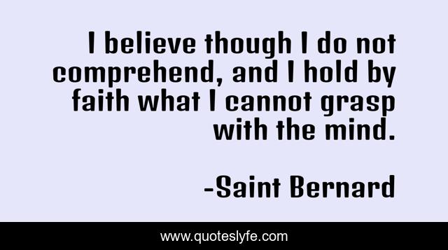 This page presents the quote "I believe though I do not comprehend, and I hold by faith what I cannot grasp with the mind.". Author of this quote is Saint Bernard. This quote is about i believe, believe, mind,.