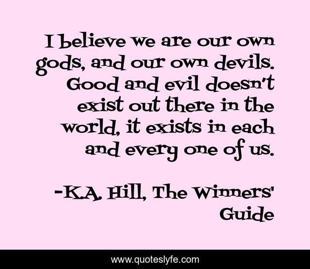 This page presents the quote "I believe we are our own gods, and our own devils. Good and evil doesn’t exist out there in the world, it exists in each and every one of us.". Author of this quote is K.A. Hill, The Winners' Guide. This quote is about devil, god, religion, good-and-evil, satan, gods,.