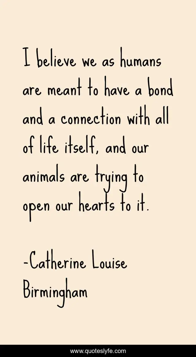 This page presents the quote "I believe we as humans are meant to have a bond and a connection with all of life itself, and our animals are trying to open our hearts to it.". Author of this quote is Catherine Louise Birmingham. This quote is about connection, animals, open-heart, bonds,.
