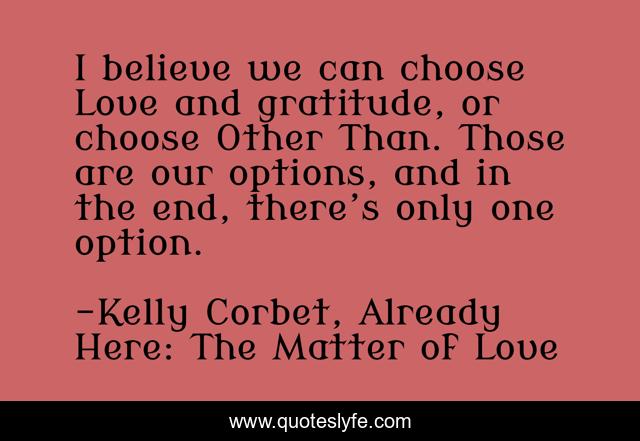 This page presents the quote "I believe we can choose Love and gratitude, or choose Other Than. Those are our options, and in the end, there’s only one option.". Author of this quote is Kelly Corbet, Already Here: The Matter of Love. This quote is about gratitude, love, affection,.