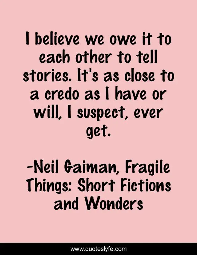 This page presents the quote "I believe we owe it to each other to tell stories. It's as close to a credo as I have or will, I suspect, ever get.". Author of this quote is Neil Gaiman, Fragile Things: Short Fictions and Wonders. This quote is about stories, storytelling,.