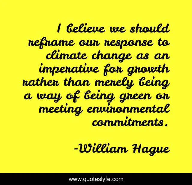 This page presents the quote "I believe we should reframe our response to climate change as an imperative for growth rather than merely being a way of being green or meeting environmental commitments.". Author of this quote is William Hague. This quote is about believe, growth, change,.