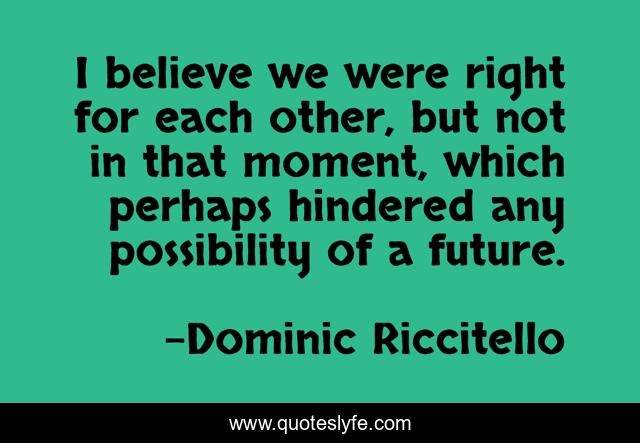 This page presents the quote "I believe we were right for each other, but not in that moment, which perhaps hindered any possibility of a future.". Author of this quote is Dominic Riccitello. This quote is about believe, love, belief, relationship, quote, couple, hurt, past, moment,.