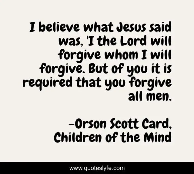 This page presents the quote "I believe what Jesus said was, 'I the Lord will forgive whom I will forgive. But of you it is required that you forgive all men.". Author of this quote is Orson Scott Card, Children of the Mind. This quote is about forgiveness, jesus,.