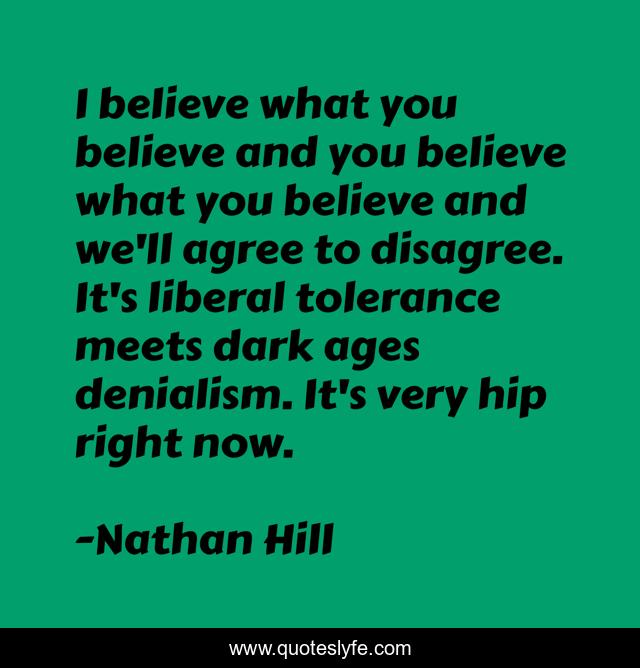 This page presents the quote "I believe what you believe and you believe what you believe and we'll agree to disagree. It's liberal tolerance meets dark ages denialism. It's very hip right now.". Author of this quote is Nathan Hill. This quote is about hip, tolerance, nihilism,.