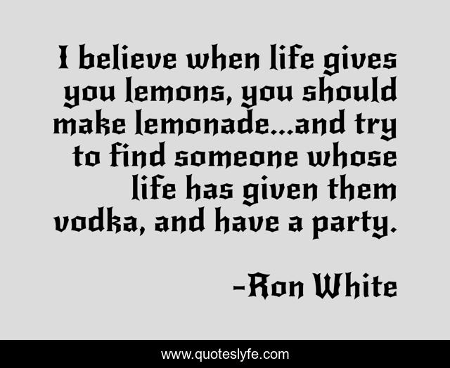 This page presents the quote "I believe when life gives you lemons, you should make lemonade...and try to find someone whose life has given them vodka, and have a party.". Author of this quote is Ron White. This quote is about party, life, lemons,.