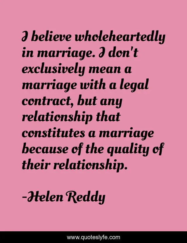 This page presents the quote "I believe wholeheartedly in marriage. I don't exclusively mean a marriage with a legal contract, but any relationship that constitutes a marriage because of the quality of their relationship.". Author of this quote is Helen Reddy. This quote is about marriage, relationship,.