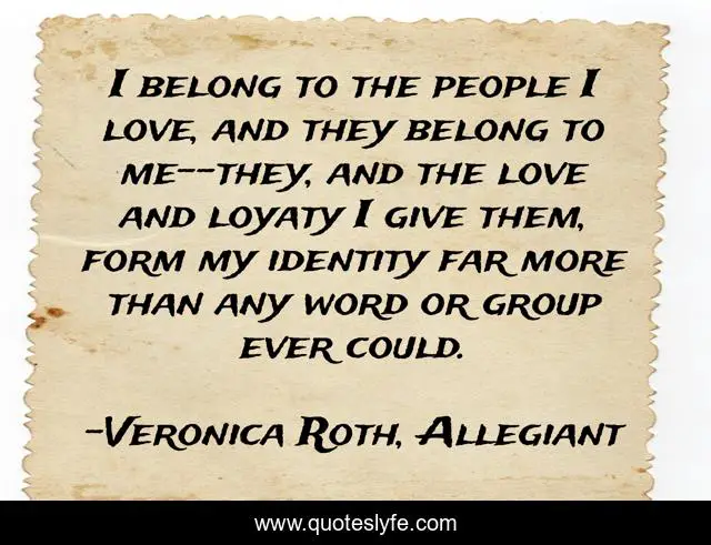 This page presents the quote "I belong to the people I love, and they belong to me--they, and the love and loyaty I give them, form my identity far more than any word or group ever could.". Author of this quote is Veronica Roth, Allegiant. This quote is about identity, love, affection, tris, loyalty,.