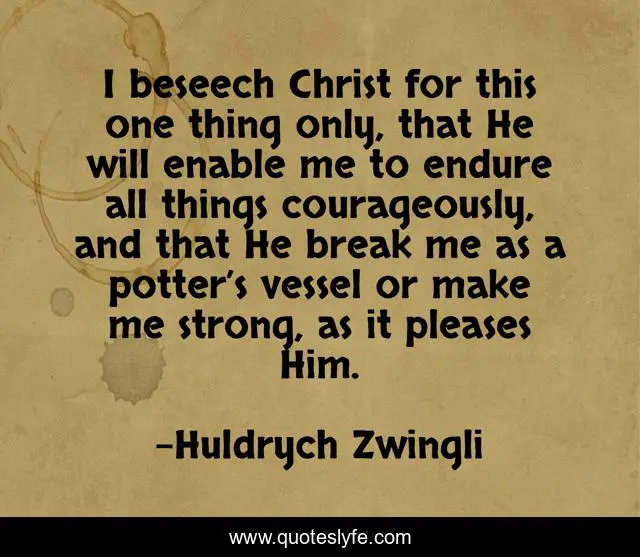 This page presents the quote "I beseech Christ for this one thing only, that He will enable me to endure all things courageously, and that He break me as a potter’s vessel or make me strong, as it pleases Him.". Author of this quote is Huldrych Zwingli. .