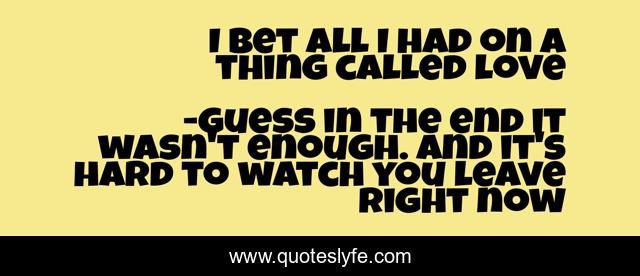 This page presents the quote "I bet all I had on a thing called love". Author of this quote is guess in the end it wasn't enough. And it's hard to watch you leave right now. .