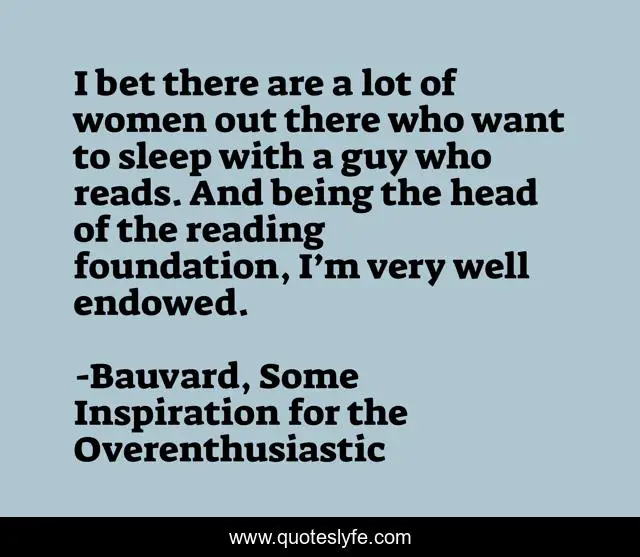 This page presents the quote "I bet there are a lot of women out there who want to sleep with a guy who reads. And being the head of the reading foundation, I’m very well endowed.". Author of this quote is Bauvard, Some Inspiration for the Overenthusiastic. This quote is about funny, comedy, humor, writing,.