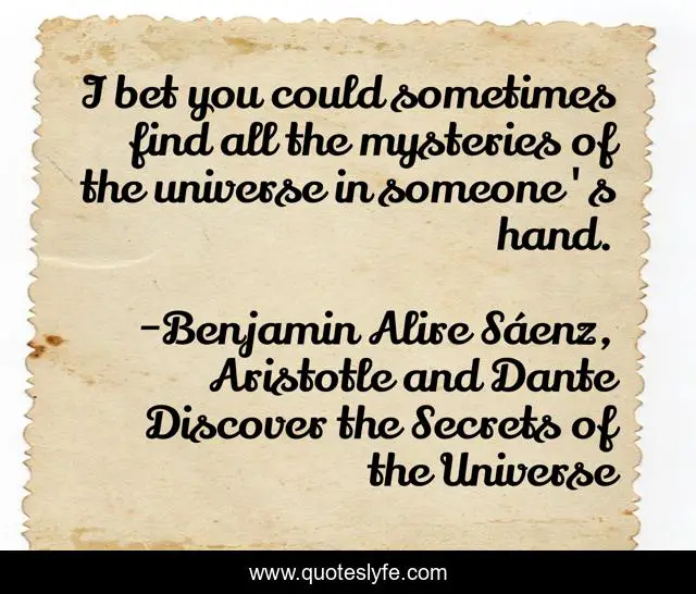 This page presents the quote "I bet you could sometimes find all the mysteries of the universe in someone's hand.". Author of this quote is Benjamin Alire Sáenz, Aristotle and Dante Discover the Secrets of the Universe. This quote is about love, true, answers, affection, universe,.