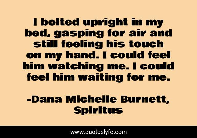 This page presents the quote "I bolted upright in my bed, gasping for air and still feeling his touch on my hand. I could feel him watching me. I could feel him waiting for me.". Author of this quote is Dana Michelle Burnett, Spiritus. This quote is about nightmares, ghosts,.