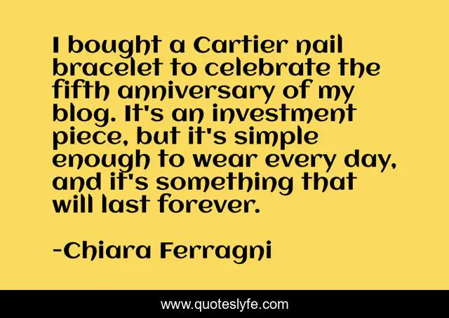 This page presents the quote "I bought a Cartier nail bracelet to celebrate the fifth anniversary of my blog. It's an investment piece, but it's simple enough to wear every day, and it's something that will last forever.". Author of this quote is Chiara Ferragni. This quote is about simple, day, celebrate,.