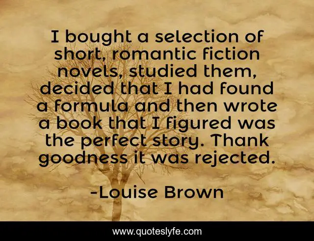 This page presents the quote "I bought a selection of short, romantic fiction novels, studied them, decided that I had found a formula and then wrote a book that I figured was the perfect story. Thank goodness it was rejected.". Author of this quote is Louise Brown. This quote is about perfect, short, book,.