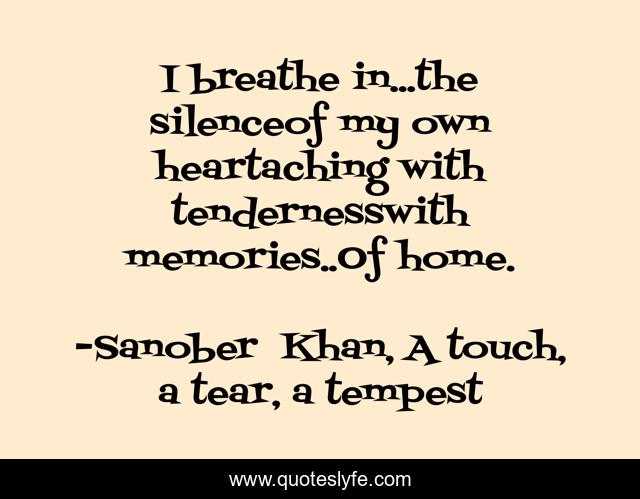 This page presents the quote "I breathe in...the silenceof my own heartaching with tendernesswith memories..Of home.". Author of this quote is Sanober Khan, A touch, a tear, a tempest. This quote is about heart, breathe-in, memories, indian-authors, poetry, tenderness, aching, ache, home,.