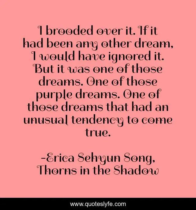 This page presents the quote "I brooded over it. If it had been any other dream, I would have ignored it. But it was one of those dreams. One of those purple dreams. One of those dreams that had an unusual tendency to come true.". Author of this quote is Erica Sehyun Song, Thorns in the Shadow. This quote is about fantasy, coming-of-age, young-adult-fiction, historical-fiction, young-adult, young-adult-fantasy,.