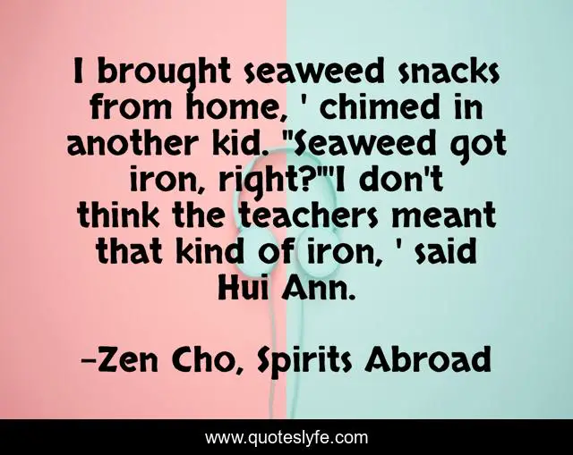 This page presents the quote "I brought seaweed snacks from home, ' chimed in another kid. "Seaweed got iron, right?"'I don't think the teachers meant that kind of iron, ' said Hui Ann.". Author of this quote is Zen Cho, Spirits Abroad. This quote is about spirits, myth, malaysia, supernatural, ghosts, legend,.