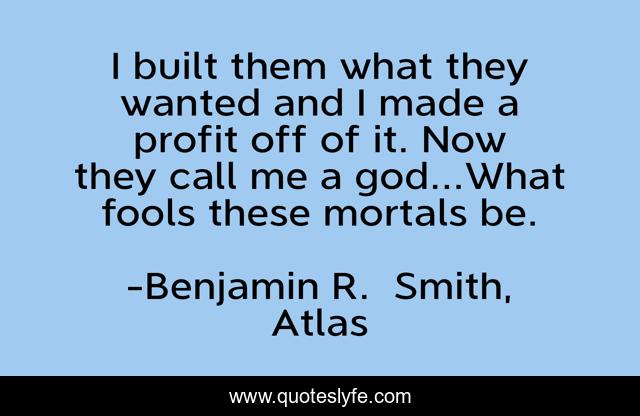 This page presents the quote "I built them what they wanted and I made a profit off of it. Now they call me a god...What fools these mortals be.". Author of this quote is Benjamin R. Smith, Atlas. This quote is about profit, gods, business, mortals,.