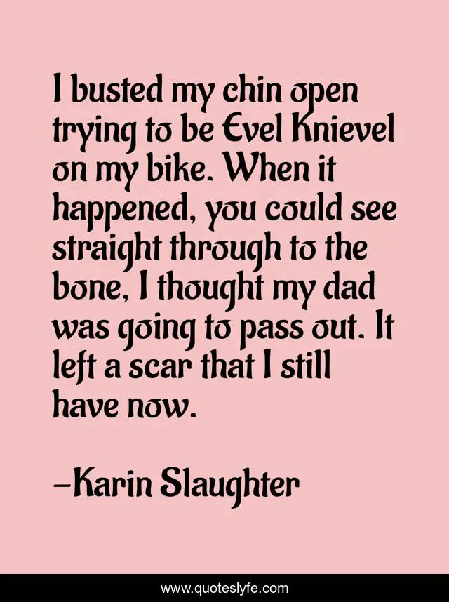 This page presents the quote "I busted my chin open trying to be Evel Knievel on my bike. When it happened, you could see straight through to the bone, I thought my dad was going to pass out. It left a scar that I still have now.". Author of this quote is Karin Slaughter. This quote is about thought, bike,.