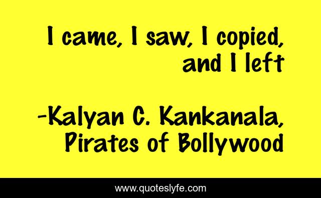This page presents the quote "I came, I saw, I copied, and I left". Author of this quote is Kalyan C. Kankanala, Pirates of Bollywood. This quote is about pirates, entertainment, piracy, legal, copyrights, bollywood, thriller,.