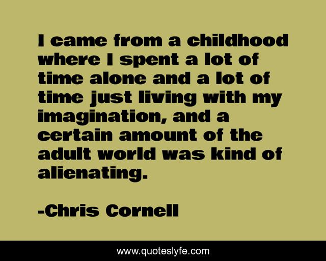 This page presents the quote "I came from a childhood where I spent a lot of time alone and a lot of time just living with my imagination, and a certain amount of the adult world was kind of alienating.". Author of this quote is Chris Cornell. This quote is about alone, childhood, time,.
