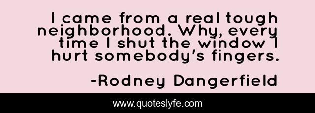 This page presents the quote "I came from a real tough neighborhood. Why, every time I shut the window I hurt somebody's fingers.". Author of this quote is Rodney Dangerfield. This quote is about funny, comedy, humour, neighborhoods,.