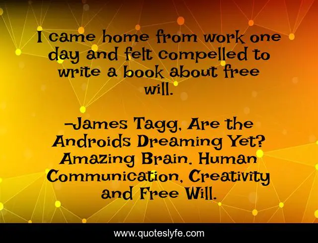 This page presents the quote "I came home from work one day and felt compelled to write a book about free will.". Author of this quote is James Tagg, Are the Androids Dreaming Yet? Amazing Brain. Human Communication, Creativity and Free Will.. This quote is about free-will, writing,.