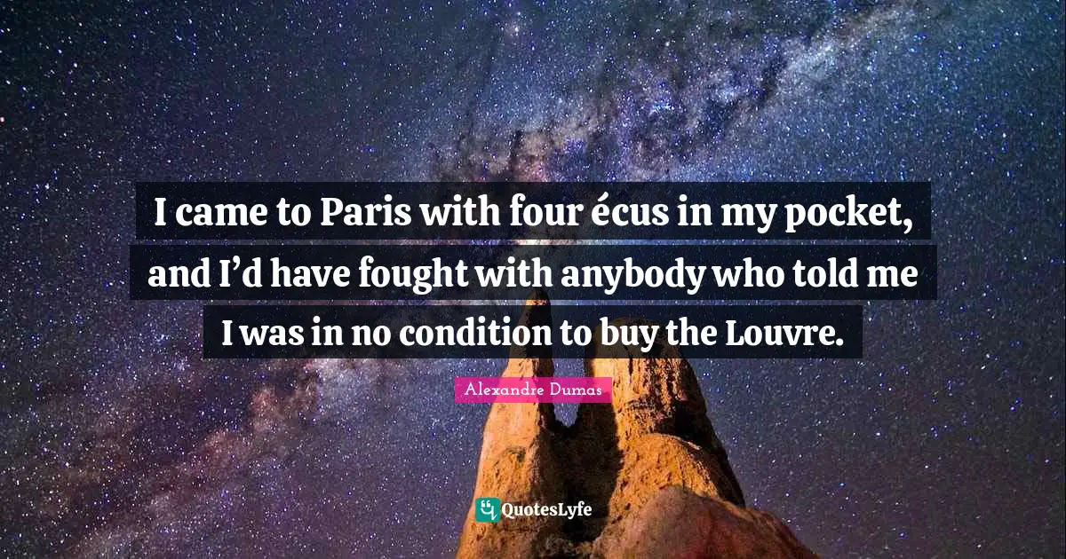 This page presents the quote "I came to Paris with four écus in my pocket, and I’d have fought with anybody who told me I was in no condition to buy the Louvre.". Author of this quote is Alexandre Dumas. This quote is about paris, pockets, four, louvre,.
