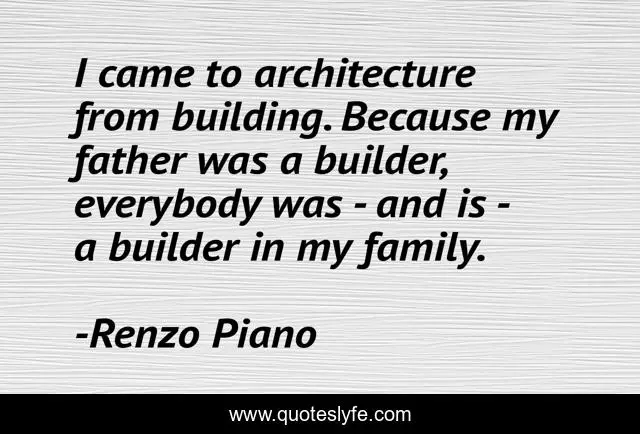 This page presents the quote "I came to architecture from building. Because my father was a builder, everybody was - and is - a builder in my family.". Author of this quote is Renzo Piano. This quote is about building, father, family,.