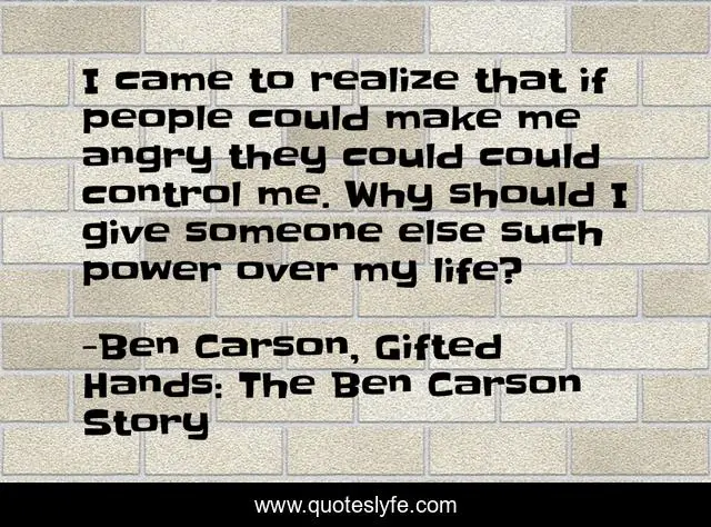 This page presents the quote "I came to realize that if people could make me angry they could could control me. Why should I give someone else such power over my life?". Author of this quote is Ben Carson, Gifted Hands: The Ben Carson Story. This quote is about anger, temper,.
