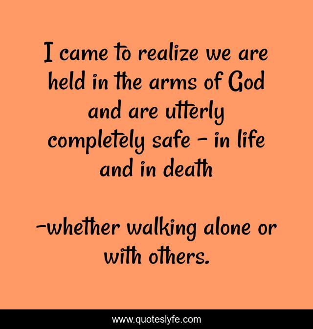 This page presents the quote "I came to realize we are held in the arms of God and are utterly completely safe - in life and in death". Author of this quote is whether walking alone or with others.. This quote is about edie littlefield sundby, the mission walker: i was given three months to live...,.
