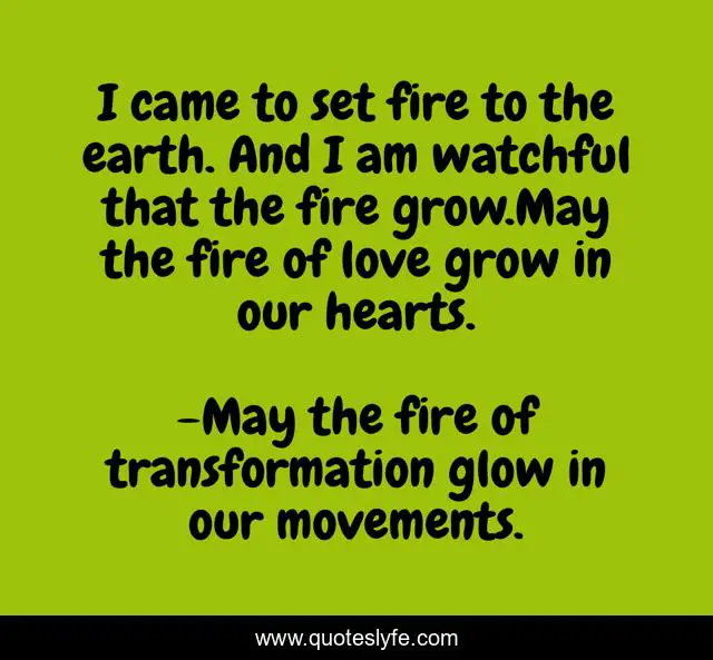 This page presents the quote "I came to set fire to the earth. And I am watchful that the fire grow.May the fire of love grow in our hearts.". Author of this quote is May the fire of transformation glow in our movements.. .