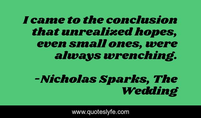 This page presents the quote "I came to the conclusion that unrealized hopes, even small ones, were always wrenching.". Author of this quote is Nicholas Sparks, The Wedding. This quote is about dreams, hope,.