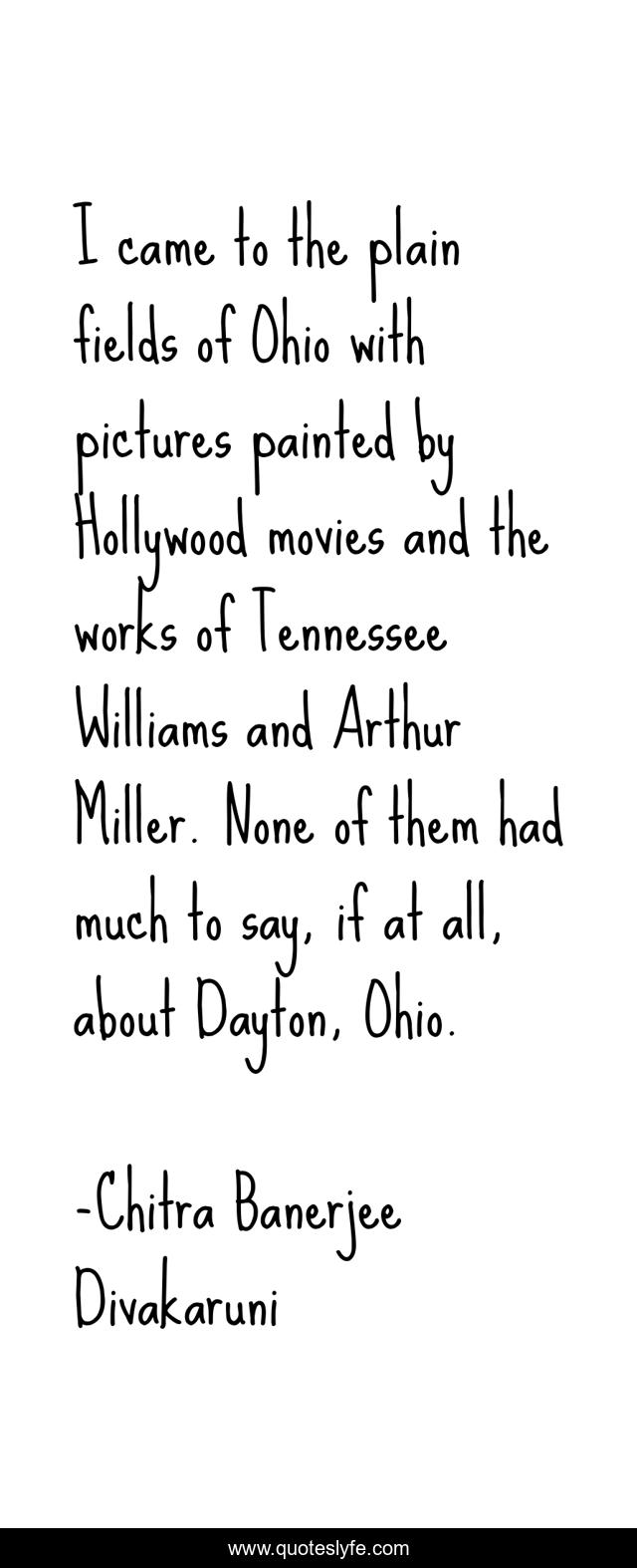 This page presents the quote "I came to the plain fields of Ohio with pictures painted by Hollywood movies and the works of Tennessee Williams and Arthur Miller. None of them had much to say, if at all, about Dayton, Ohio.". Author of this quote is Chitra Banerjee Divakaruni. This quote is about pictures, hollywood,.