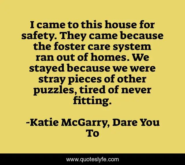 This page presents the quote "I came to this house for safety. They came because the foster care system ran out of homes. We stayed because we were stray pieces of other puzzles, tired of never fitting.". Author of this quote is Katie McGarry, Dare You To. This quote is about abuse, family, foster-care,.