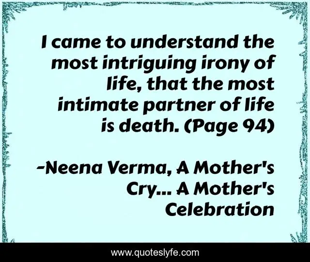 This page presents the quote "I came to understand the most intriguing irony of life, that the most intimate partner of life is death. (Page 94)". Author of this quote is Neena Verma, A Mother's Cry... A Mother's Celebration. This quote is about life, death, life-and-death, irony-of-life,.