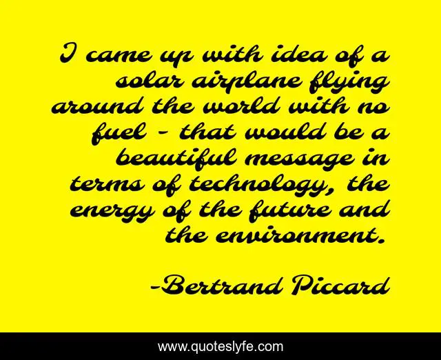 This page presents the quote "I came up with idea of a solar airplane flying around the world with no fuel - that would be a beautiful message in terms of technology, the energy of the future and the environment.". Author of this quote is Bertrand Piccard. This quote is about beautiful, world, future,.