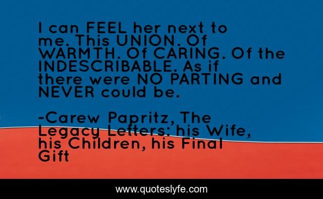 This page presents the quote "I can FEEL her next to me. This UNION. Of WARMTH. Of CARING. Of the INDESCRIBABLE. As if there were NO PARTING and NEVER could be.". Author of this quote is Carew Papritz, The Legacy Letters: his Wife, his Children, his Final Gift. This quote is about relationships-love, love, love-and-sayings, quotes, feel, carew-s, quotes-by-carew, legacy, books,.