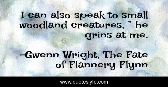 This page presents the quote "I can also speak to small woodland creatures, ” he grins at me.". Author of this quote is Gwenn Wright, The Fate of Flannery Flynn. This quote is about darrell-holloway, pnr, horror, ya-pnr, paranormal, flannery-flynn, suspense, gwenn-wright, ghosts,.