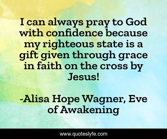 This page presents the quote "I can always pray to God with confidence because my righteous state is a gift given through grace in faith on the cross by Jesus!". Author of this quote is Alisa Hope Wagner, Eve of Awakening. This quote is about faith, confidence, god, jesus, christianity, grace,.