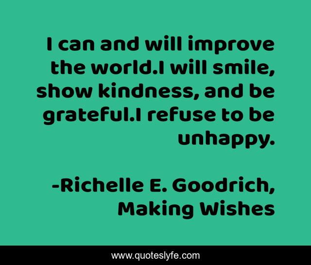 This page presents the quote "I can and will improve the world.I will smile, show kindness, and be grateful.I refuse to be unhappy.". Author of this quote is Richelle E. Goodrich, Making Wishes. This quote is about gratitude, positive-outlook, richelle-e-goodrich, positive-thinking, reaching-out, change-the-world, richelle, happiness, gratefulness,.
