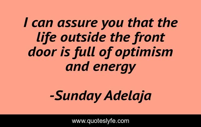 This page presents the quote "I can assure you that the life outside the front door is full of optimism and energy". Author of this quote is Sunday Adelaja. This quote is about life, door, energy, front-door, optimism, calling, purpose, truth, assurance,.