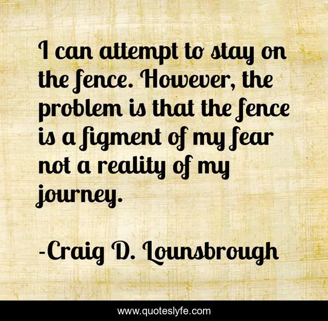 This page presents the quote "I can attempt to stay on the fence. However, the problem is that the fence is a figment of my fear not a reality of my journey.". Author of this quote is Craig D. Lounsbrough. This quote is about life, fence, apprehension, fears, reality, figment, journey, fear, frightened,.