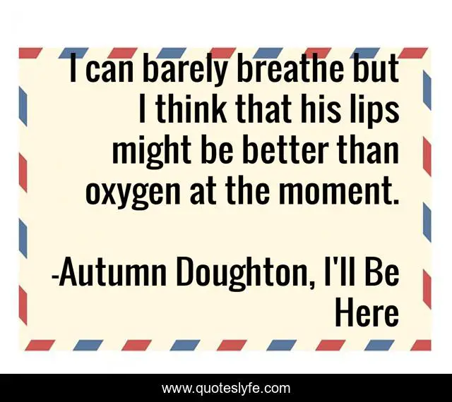 This page presents the quote "I can barely breathe but I think that his lips might be better than oxygen at the moment.". Author of this quote is Autumn Doughton, I'll Be Here. This quote is about relationships, love, autumn-doughton, i-ll-be-here, romance, kissing, affection,.