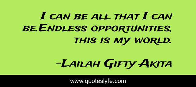 This page presents the quote "I can be all that I can be.Endless opportunities, this is my world.". Author of this quote is Lailah Gifty Akita. This quote is about lailah-gifty-akita-affirmations, capable, i-am-great, opportunities, can-be, capable-of-more, opportunity-knocks, inspirational, greatness,.