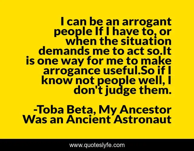This page presents the quote "I can be an arrogant people If I have to, or when the situation demands me to act so.It is one way for me to make arrogance useful.So if I know not people well, I don't judge them.". Author of this quote is Toba Beta, My Ancestor Was an Ancient Astronaut. This quote is about judge, appearance, surface, arrogance,.
